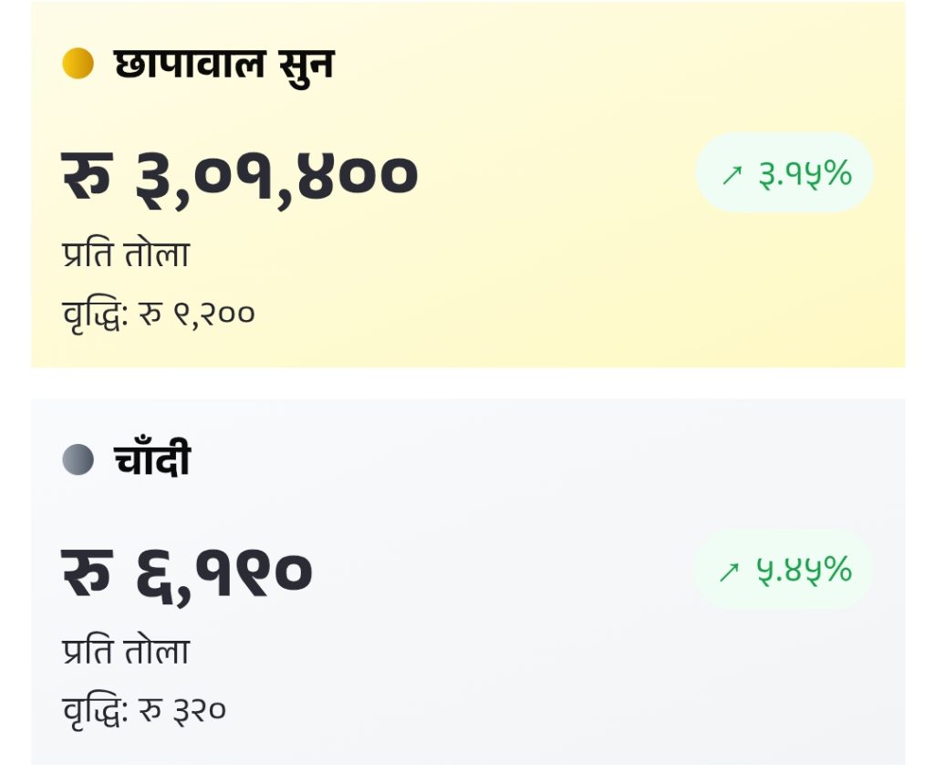 यस वृद्धिसँगै नेपाली बजारमा सुनको मूल्य इतिहासमै पहिलो पटक ३ लाख रुपैयाँको मनोवैज्ञानिक सीमा पार गर्दै ३ लाख १ हजार ४ सय रुपैयाँ पुगेको हो। अन्तर्राष्ट्रिय बजारमा सुनको मूल्यमा आएको उतारचढाव तथा अमेरिकी डलरको मजबुतीका कारण स्थानीय बजारमा यसको प्रत्यक्ष असर परेको व्यवसायीहरू बताउँछन्।