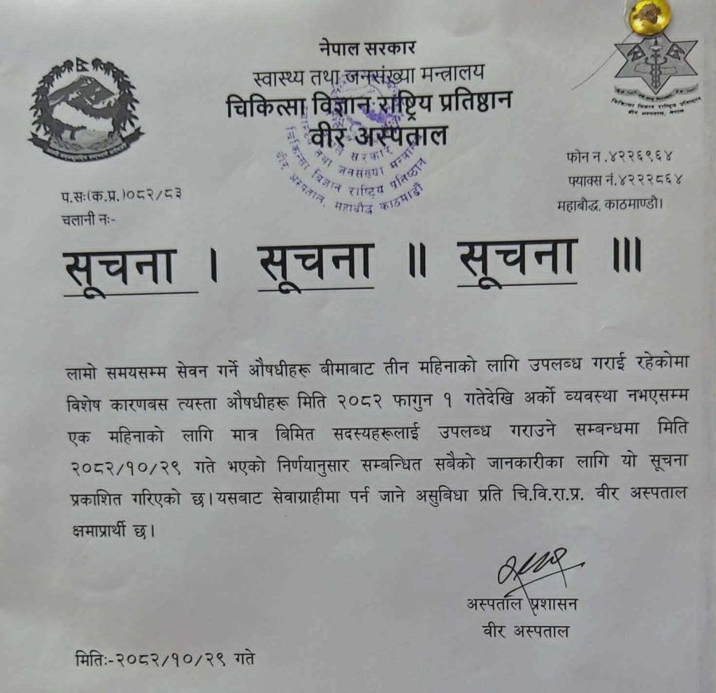 उक्त सूचना मिति २०८२/१०/२९ गते अस्पताल प्रशासन, वीर अस्पतालद्वारा जारी गरिएको हो।