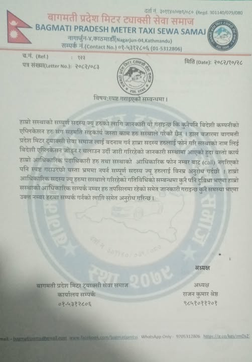 बागमती प्रदेश मिटर ट्याक्सी सेवा समाजद्वारा जारी गरिएको उक्त सूचनाले सदस्यहरूलाई भ्रामक फोन र गलत सूचनाबाट सतर्क रहन आग्रह गरेको छ।