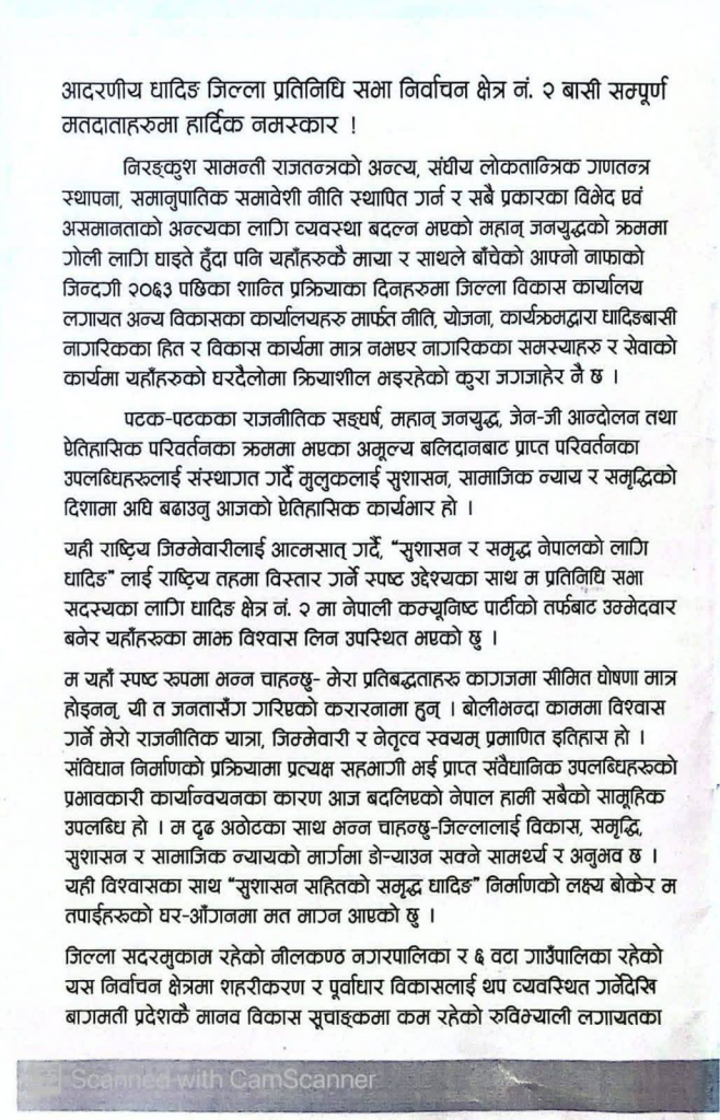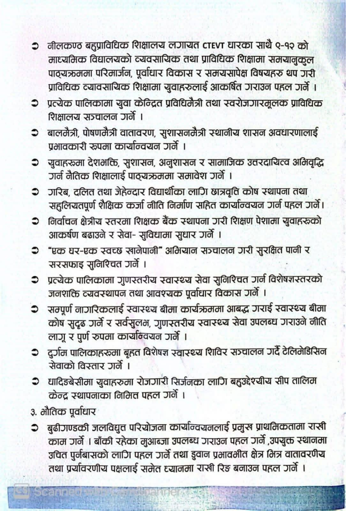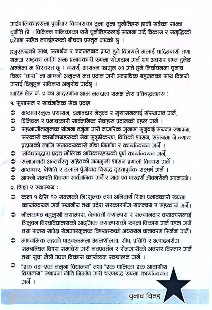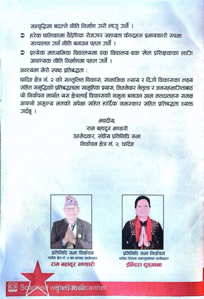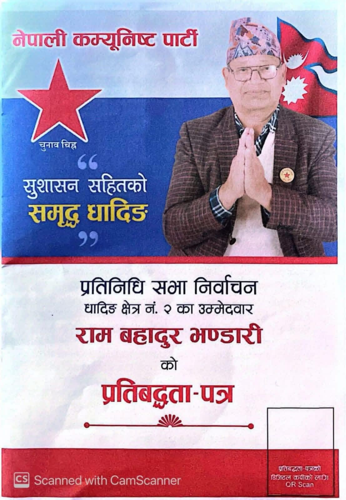 प्रतिनिधि सभा सदस्य निर्वाचन क्षेत्र नम्बर–२ का नेपाली कम्यूनिट पार्टी का उमेद्वार राम बहादुर भण्डारी ले सार्वजनिक गरेको चुनावी प्रतिबद्धता पत्रमा विभिन्न विकास योजनाहरू समेटिए पनि केही महत्वपूर्ण विषय छुटेका छन्।