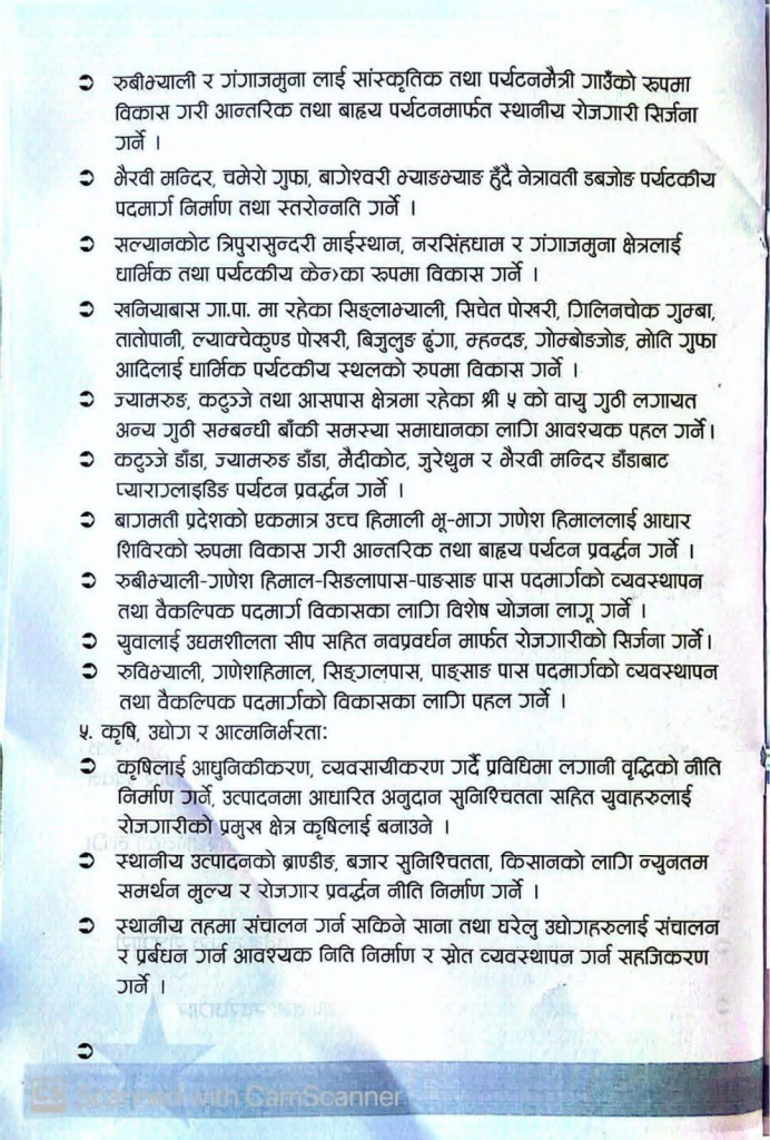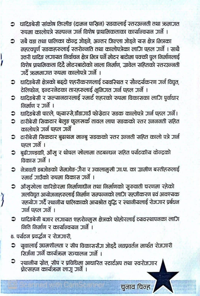 त्यस्तै सेमजोङ–गैरा र ज्वालामुखी क्षेत्रका ग्रामीण बस्तीलाई स्मार्ट गाउँका रूपमा विकास गर्ने प्रतिबद्धता पनि पत्रमा समावेश गरिएको छ। पालिकाभित्रका सडक स्तरोन्नति गरिने सामान्य उल्लेख भए पनि अन्य स्थानमा जस्तै स्पष्ट योजना सहित उल्लेख गरिएको छैन।