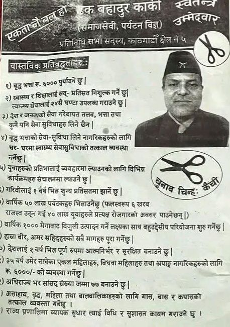 काठमाडौँ क्षेत्र नम्बर–५ बाट प्रतिनिधि सभा सदस्य निर्वाचनमा स्वतन्त्र उम्मेदवार बनेका ढक बहादुर कार्कीले आफ्नो चुनावी घोषणापत्र सार्वजनिक गर्दै जनजीवनसँग प्रत्यक्ष जोडिएका वास्तविक र व्यवहारिक प्रतिबद्धता सार्वजनिक गरेका छन्।