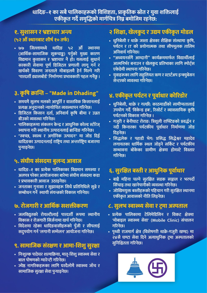 त्यसैगरी, एकीकृत पर्यटन र पूर्वाधार कोरिडोर निर्माण गरी धादिङको प्राकृतिक, सांस्कृतिक र धार्मिक सम्भावनालाई आर्थिक समृद्धिसँग जोडिने उल्लेख गरिएको छ। सुरक्षित बस्ती र आधुनिक पूर्वाधार विकासमार्फत नागरिकलाई गुणस्तरीय जीवन सुनिश्चित गर्ने योजना पनि घोषणापत्रमा समेटिएको छ।