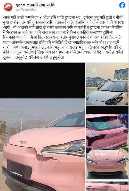 बुटवल ट्याक्सी सेवा प्रा.ली. का ४ वटा ईभी ट्याक्सी फागुन ०६ गते मात्रै विभिन्न दुर्घटनामा परेका छन्। कम्पनीका अनुसार दुर्घटना हुनु नौलो विषय नभए पनि सबै दुर्घटनामा आफ्नै चालकको गल्ती देखिनु गम्भीर चिन्ताको विषय बनेको छ भनिएको छ ।