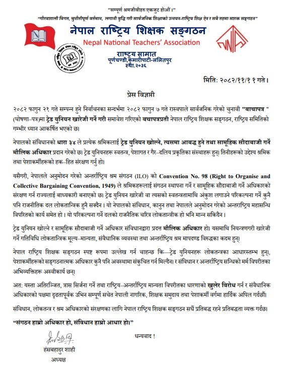 नेपाल राष्ट्रिय शिक्षक सङ्गठनले संविधान, लोकतन्त्र र श्रमिक अधिकारको संरक्षणका लागि निरन्तर प्रतिबद्ध रहने स्पष्ट पार्दै, सबै सरोकारवालालाई संवैधानिक मूल्य–मान्यता तथा अन्तर्राष्ट्रिय श्रम मापदण्डको सम्मान गर्न आग्रह गरेको छ।