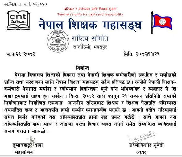 नेपाल शिक्षक महासंघ ले शिक्षक तथा शिक्षा पेशाप्रति लक्षित अपमानजनक अभिव्यक्तिप्रति गम्भीर आपत्ति जनाएको छ। महासंघले एक विज्ञप्ति जारी गर्दै शिक्षक–कर्मचारीको पेशागत मर्यादा र सम्मानमा चोट पुग्ने खालका टिप्पणी अस्वीकार्य रहेको स्पष्ट पारेको छ।
