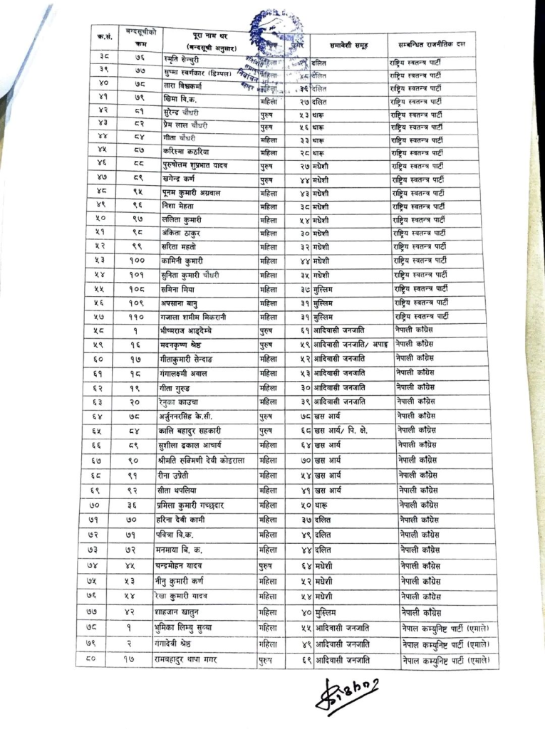 आयोग सार्वजनिक गरेको सुची अनुसार राष्ट्रिय स्वतन्त्र पार्टी (रास्वपा) ले सबैभन्दा धेरै ५१,८३,४९३ मत प्राप्त गर्दै ५७ सिट हासिल गरेको छ। नेपाली कांग्रेसले १७,५९,१७२ मतसहित २० सिट, नेकपा एमालेले १४,५५,८८५ मतसहित १६ सिट र नेपाली कम्युनिष्ट पार्टीले ८,११,५७७ मतसहित ९ सिट प्राप्त गरेका छन्।