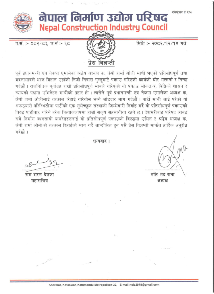 काठमाडौं — नेपाल निर्माण उद्योग परिषद्ले केपी शर्मा ओली को पक्राउप्रति कडा आपत्ति जनाएको छ। शनिबार एक प्रेस विज्ञप्ति जारी गर्दै परिषद्ले पूर्व प्रधानमन्त्री तथा नेकपा एमालेका अध्यक्ष ओलीलाई निजी निवास गुण्डुबाट पक्राउ गरिएको घटनाको घोर भर्त्सना तथा निन्दा गरेको हो।