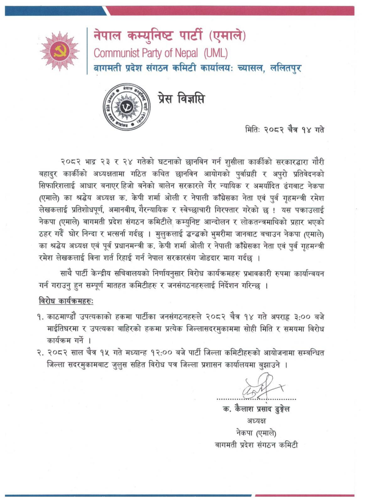 काठमाडौं — नेकपा (एमाले) बागमती प्रदेश संगठन कमिटीले पार्टी अध्यक्ष केपी शर्मा ओलीको पक्राउप्रति कडा आपत्ति जनाउँदै विरोध कार्यक्रम घोषणा गरेको छ।