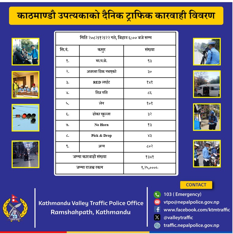 काठमाडौं — ट्राफिक नियम उल्लंघन गर्ने सवारी चालकहरूमाथि गरिएको कडाइका क्रममा हिजो शनिबार मात्र १ हजार ३४९ जना चालक ट्राफिक कारबाहीमा परेका छन्। ट्राफिक प्रहरीका अनुसार उक्त कारबाहीबाट कुल १ लाख २५ हजार रुपैयाँ राजस्व संकलन गरिएको छ।