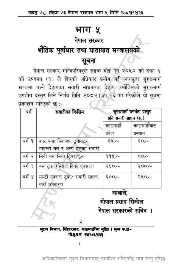 मल्टी एक्सल ट्रक तथा भारी उपकरणका लागि भने प्रवेश गर्दा ६०० रुपैयाँ र बाहिरिँदा २५० रुपैयाँ दस्तुर लाग्ने व्यवस्था गरिएको छ।