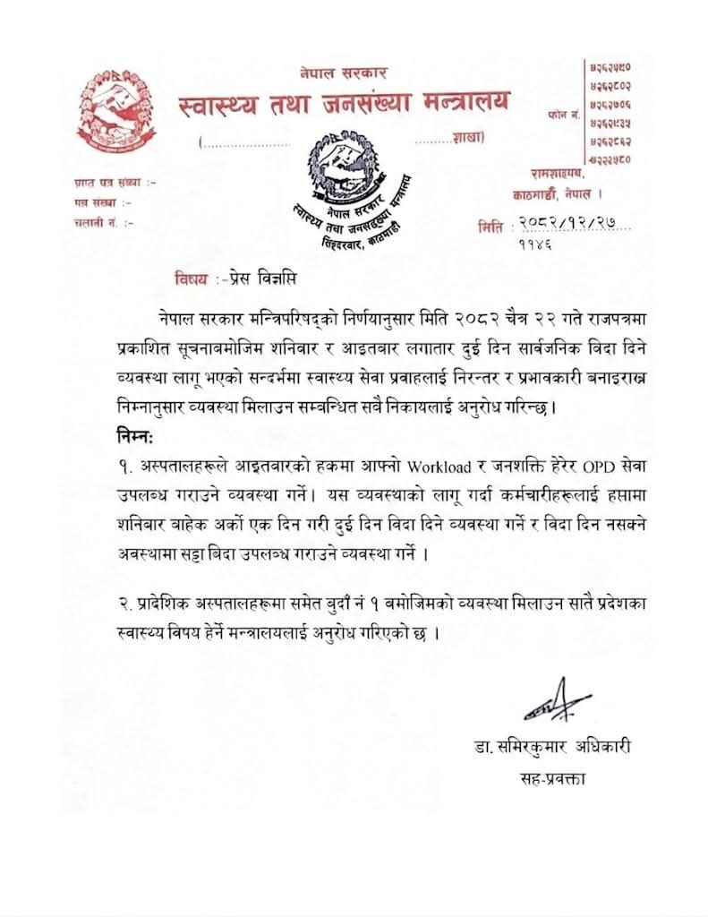 नेपाल सरकार मन्त्रिपरिषद्को निर्णय अनुसार मिति २०८२ साल चैत २२ गते राजपत्रमा प्रकाशित सूचना बमोजिम अब शनिबार र आइतबार लगातार दुई दिन सार्वजनिक बिदा लागू हुने व्यवस्था गरिएको छ। सोही सन्दर्भमा मन्त्रालयले स्वास्थ्य सेवामा कुनै अवरोध नआओस् भन्ने उद्देश्यले निर्देशन जारी गरेको हो।