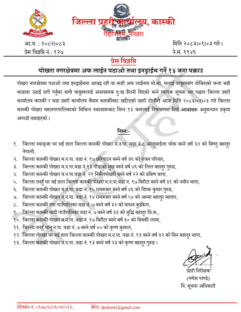 पोखरा महानगरपालिका क्षेत्रमा पठाओ तथा इनड्राइभमा आबद्ध रही वा नरही अफलाइन रूपमा मोटरसाइकल सञ्चालन गरी यात्रुहरूसँग तोकिएको भन्दा बढी भाडा असुल्ने, ठगी गर्ने तथा अनावश्यक दुःख हैरानी दिएको भन्ने व्यापक गुनासो आएपछि प्रहरीले १३ जना चालकलाई नियन्त्रणमा लिएको छ।