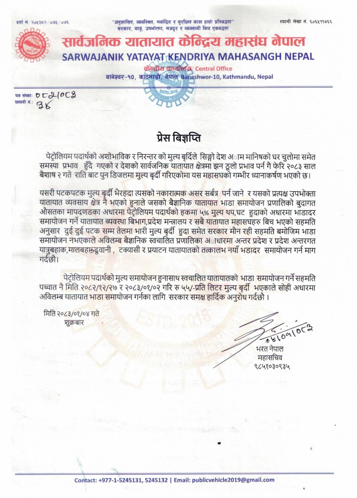 विज्ञप्तिमा २०८३ साल वैशाख २ गते रातिदेखि पुनः डिजेलको मूल्य बढाइएको भन्दै त्यसप्रति महासंघको गम्भीर ध्यानाकर्षण भएको जनाइएको छ। पटक–पटक इन्धनको मूल्य बढ्दा त्यसको प्रत्यक्ष असर यातायात व्यवसायी र उपभोक्तामा पर्ने भएकाले वैज्ञानिक तथा स्वचालित भाडा समायोजन प्रणाली लागू गर्नुपर्ने माग गरिएको छ।