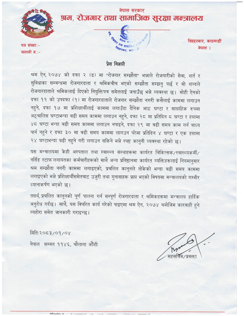यस विषयमा मन्त्रालयको गम्भीर ध्यानाकर्षण भएको जनाउँदै सम्पूर्ण रोजगारदाता र श्रमिकलाई प्रचलित कानुनको पूर्ण पालना गर्न आग्रह गरेको छ। मन्त्रालयले कानुनविपरीत कार्य गरेको पाइएमा श्रम ऐन, २०७४ बमोजिम कारबाही गरिने जनाएको छ।