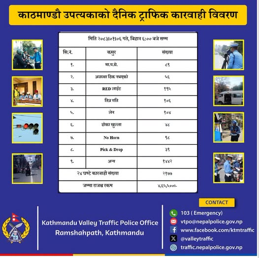 ट्राफिक प्रहरीले उपत्यकामा सुरक्षित, व्यवस्थित र अनुशासित सवारी सञ्चालनका लागि नियमित अनुगमन तथा कारबाहीलाई थप कडाइ गरिएको जनाएको छ। साथै, सबै चालकलाई ट्राफिक नियम पालना गरी जिम्मेवार ढंगले सवारी चलाउन आग्रह गरिएको छ।