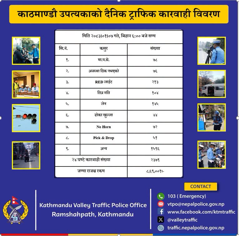 काठमाडौं, वैशाख ७ — काठमाडौं उपत्यकाभित्र ट्राफिक नियम उल्लंघन गर्ने सवारी साधनमाथि गरिएको कारबाहीबाट हिजो आइतबार मात्रै ८ लाख ६९ हजार रुपैयाँ राजस्व संकलन भएको ट्राफिक प्रहरीले जनाएको छ।