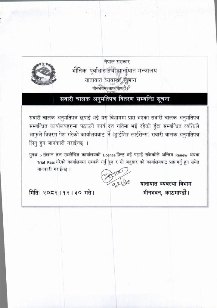 यातायात व्यवस्था विभागले लामो समयदेखि छपाइको प्रतीक्षामा रहेका सवारी चालक अनुमतिपत्र अर्थात् स्मार्ट लाइसेन्सहरू अब सम्बन्धित यातायात कार्यालयहरूमा पठाउन थालेको जनाएको छ। छपाइ प्रक्रिया सम्पन्न भएसँगै सेवाग्राहीले चाँडै आफ्नो लाइसेन्स हात पार्ने अपेक्षा गरिएको छ।