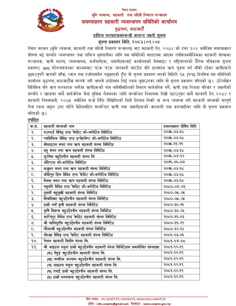 काठमाडौँ । सर्वसाधारण बचतकर्ताको अर्बौँ रुपैयाँ अपचलन गरी ‘समस्याग्रस्त’ घोषित भएका सहकारीका ऋणीहरूमाथि सरकारले अन्तिम कारबाहीको तयारी थालेको छ। भूमि व्यवस्था, सहकारी तथा गरिबी निवारण मन्त्रालय अन्तर्गतको ‘समस्याग्रस्त सहकारी व्यवस्थापन समिति’ले एक कठोर सूचना जारी गर्दै ऋण चुक्ता गर्न १५ दिनको समय सीमा दिएको हो।